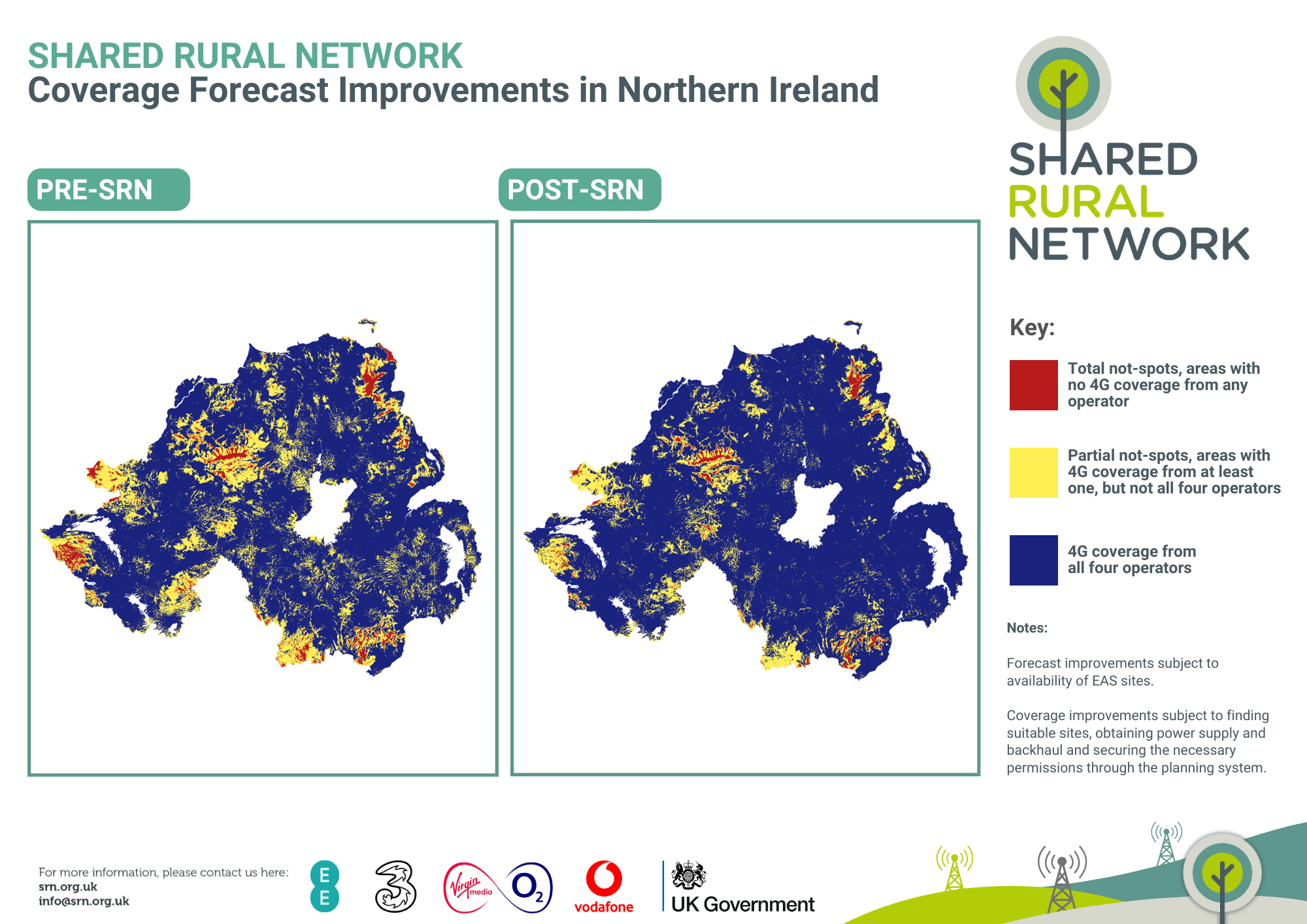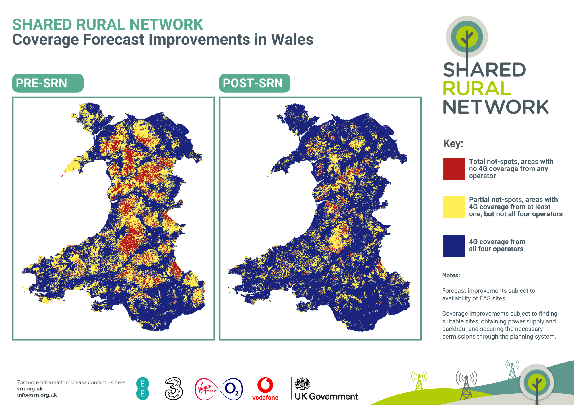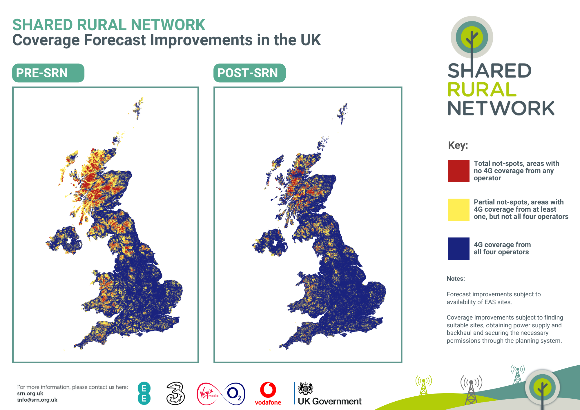Pre-SRN figures are taken from Ofcom 2020 Connected Nations data. All % figures are rounded to whole figures. The forecast improvements are subject to availability of Extended Area Service sites. Coverage improvements are subject to finding suitable sites, obtaining power supply and backhaul and securing the necessary permissions through the planning system.